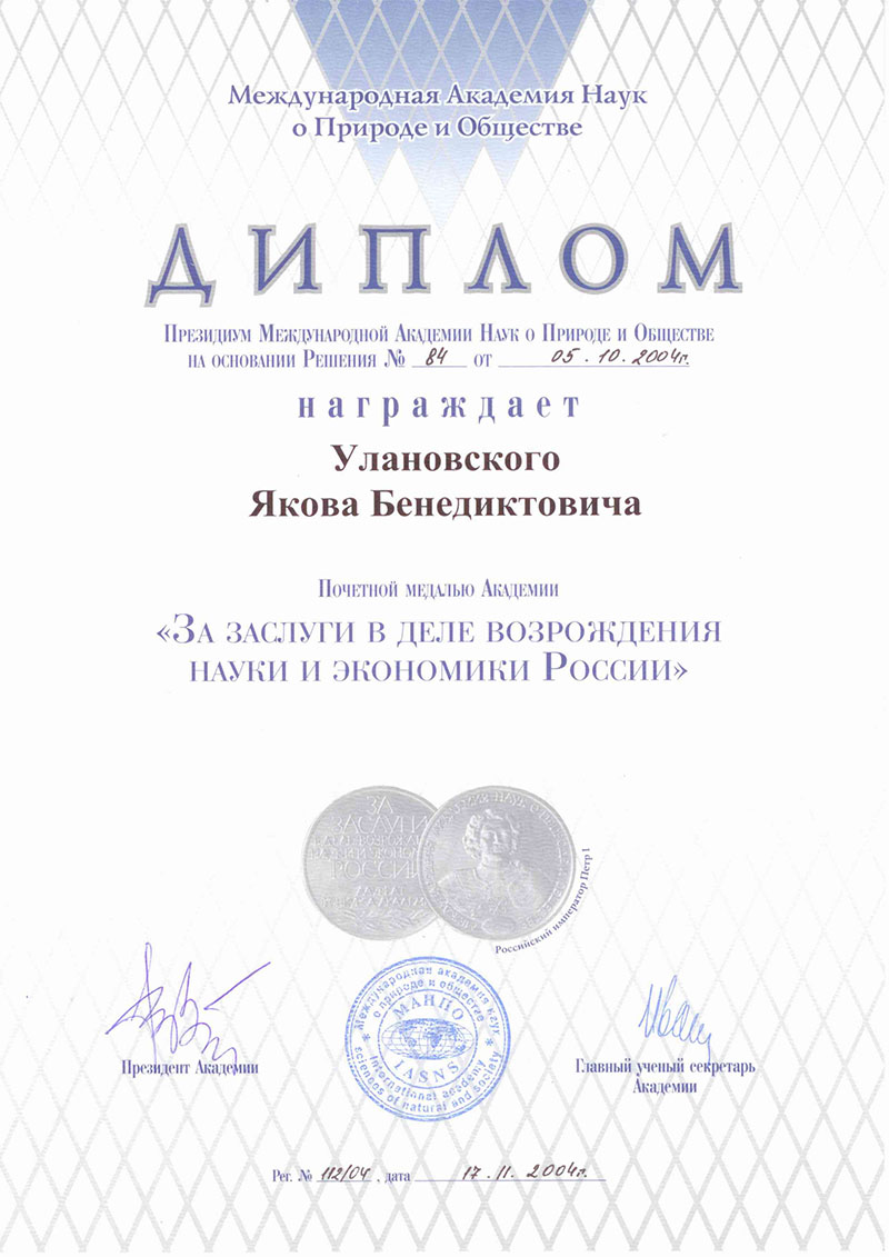 Iakov Ulanovskiy is the author of more than 100 treatises and inventions, he was awarded with the name of «The engineer of the year of Russia 2005», and he got the Grand Prix and three gold medals at the World Exhibition of Innovation in Brussels «EUREKA-2005».