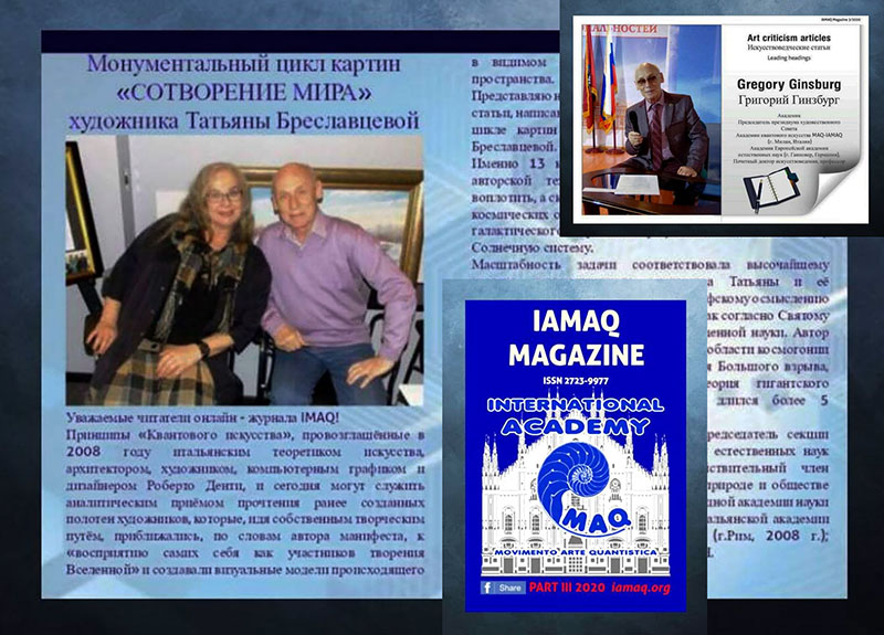 2020. Вышел в свет новый номер международного журнала Международной Академии квантового искусства MAQ IAMAQ (Милан, Италия), где опубликована статья Академика ЕАЕН, профессора Григория Гинзбурга о творчестве Заслуженного художника Европы, профессора Татьяны Бреславцевой «СОТВОРЕНИЕ МИРА». Статья представлена на русском, английском и итальянском языках.